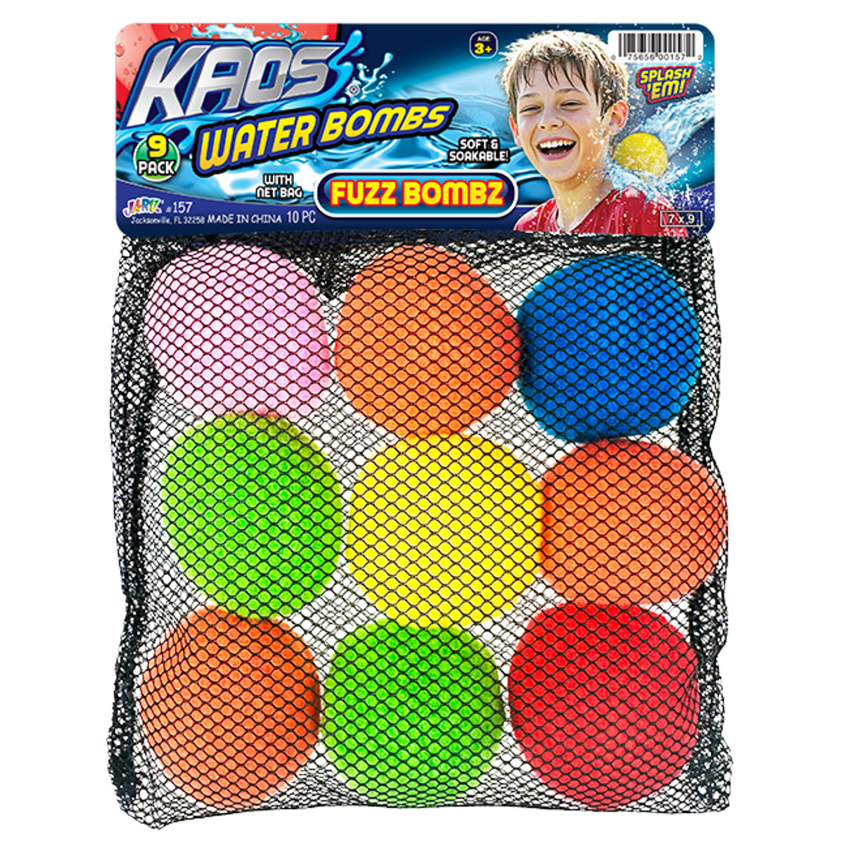Display contains: 12 water bombs. Cost $2.49 each, sell @ $4.99 each. Each pack contains 9 soft & fuzzy water bombz and a reusable net bag for storage. Soak in water and throw for a big splash. Ages 3+.