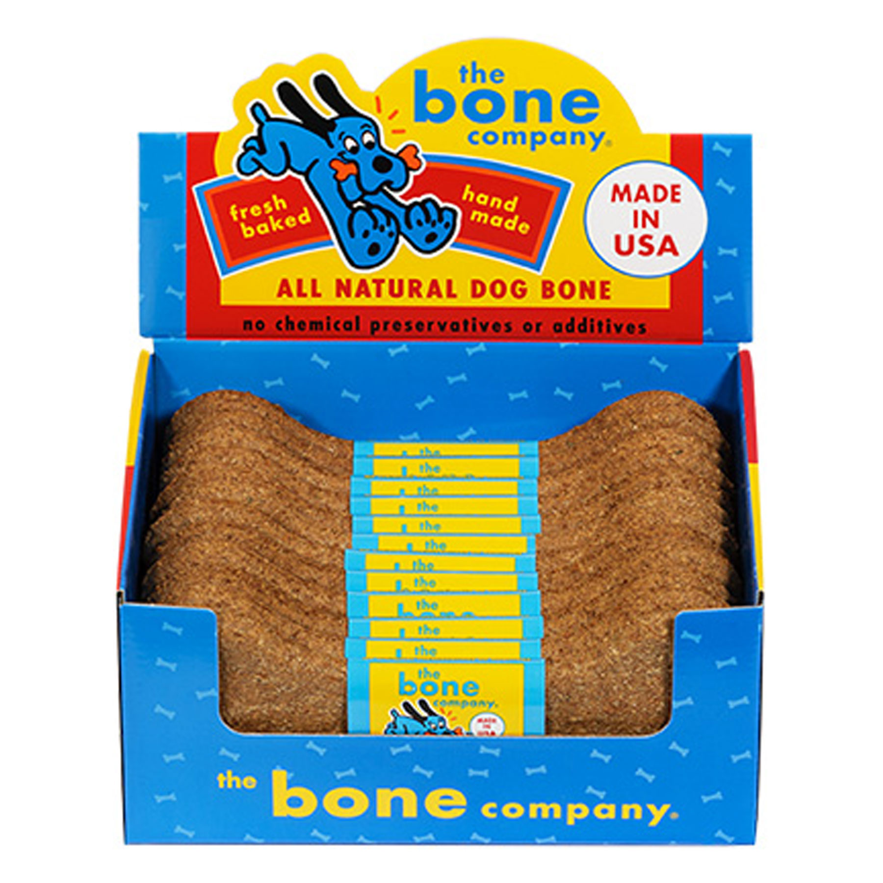 Display contains: 12 treats. Cost $1.80 each, sell @ $2.79 each. Beef flavored dog treats. Each treat is 3.2 oz shaped like a dog bone. Hand made, fresh baked with beef.