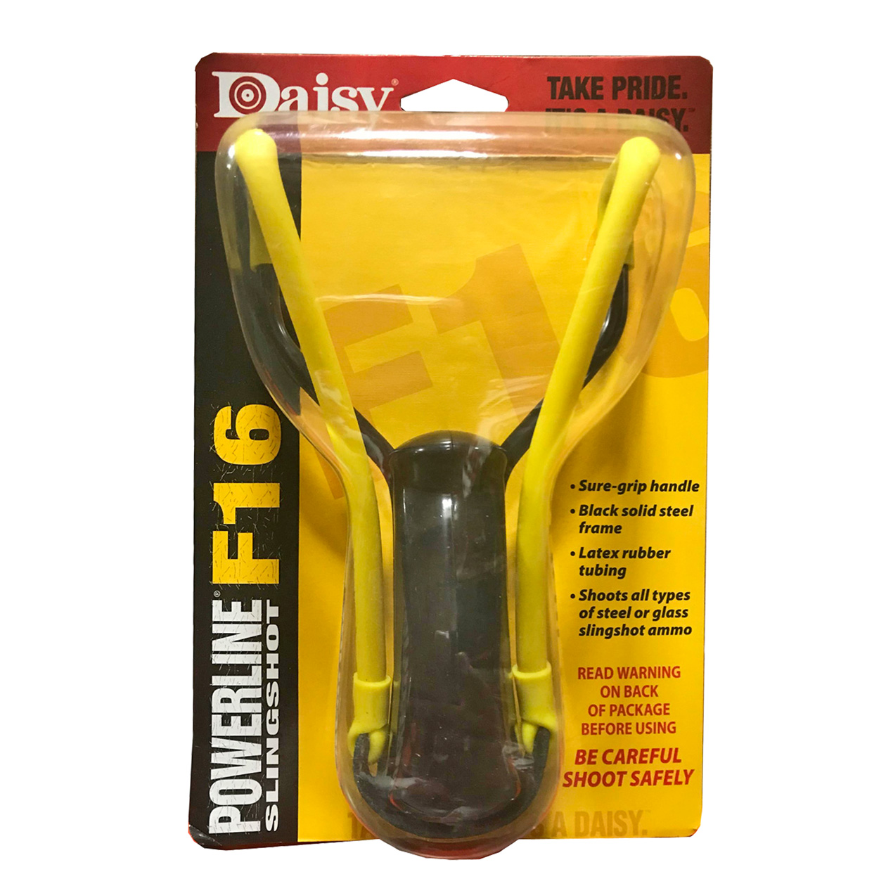 Powerline F16 Slingshot, shoots 1/4, 3/8 and 1/2 steel or glass slingshot ammo. Sure grip handle, Durable surgical tubing. peggable. Before purchasing this item, please check your local and state regulations.